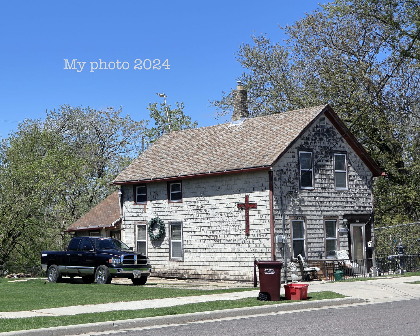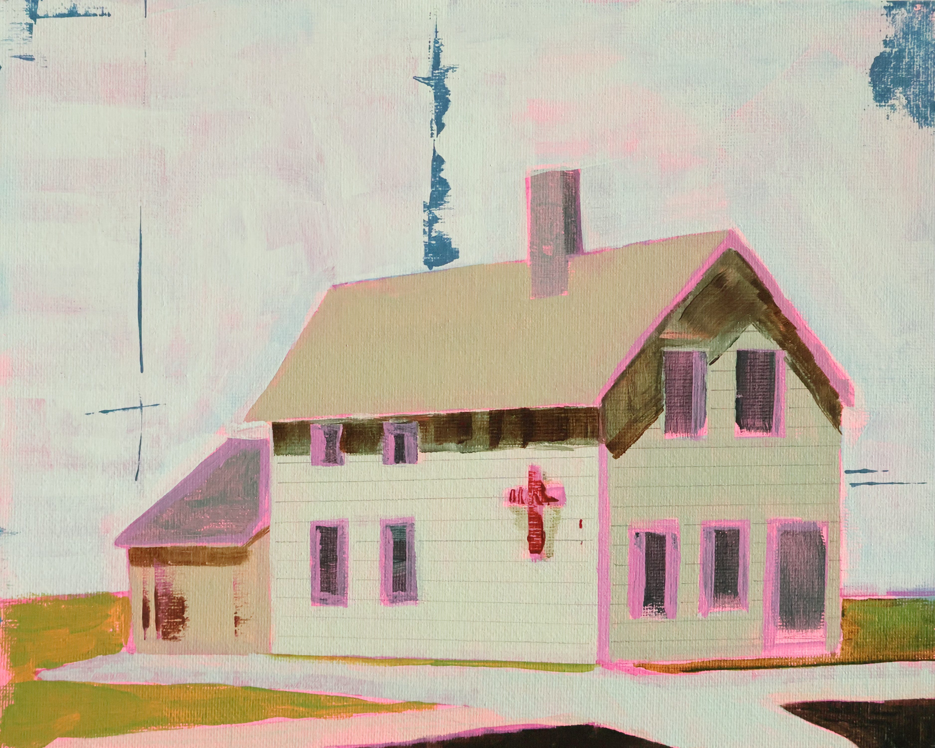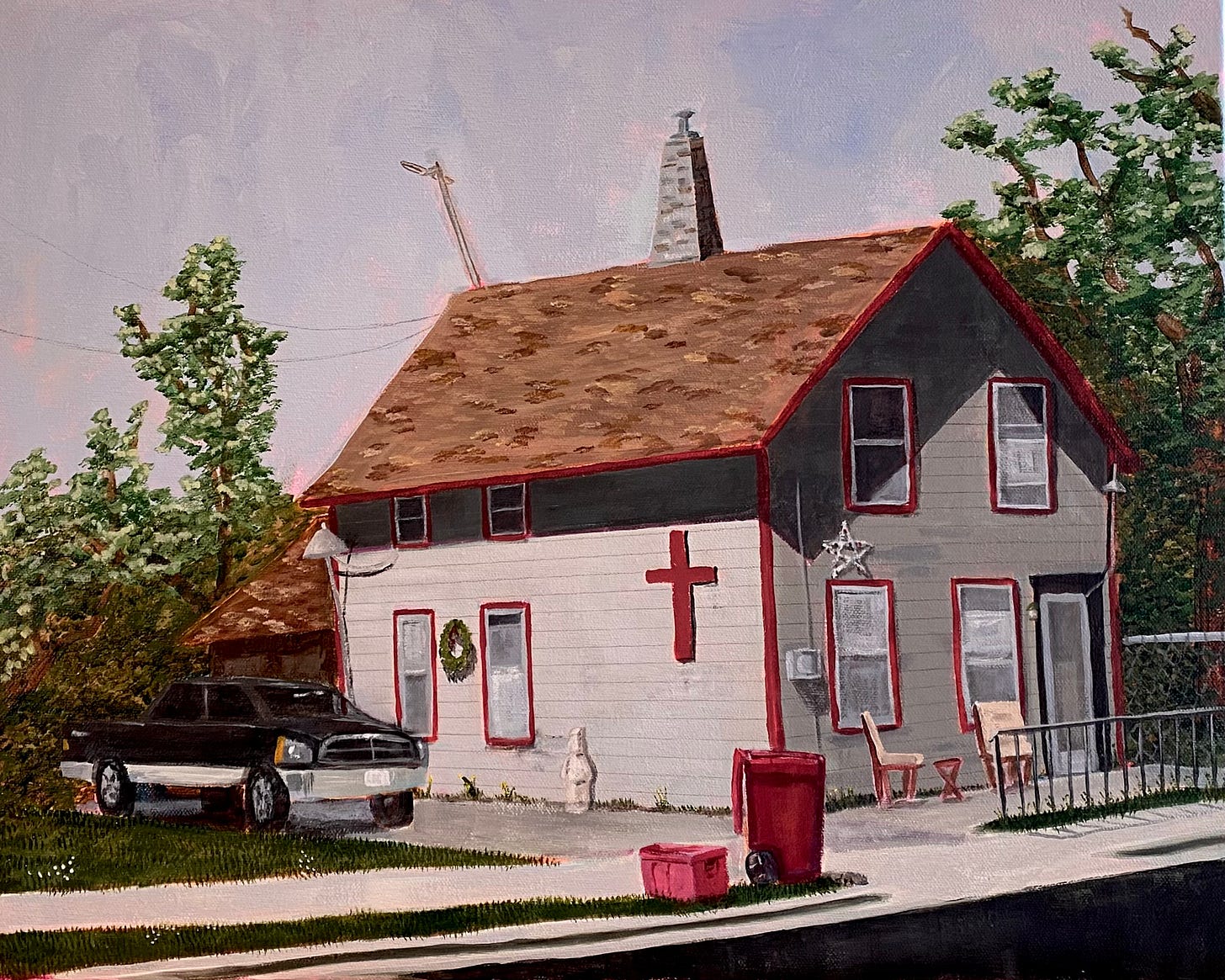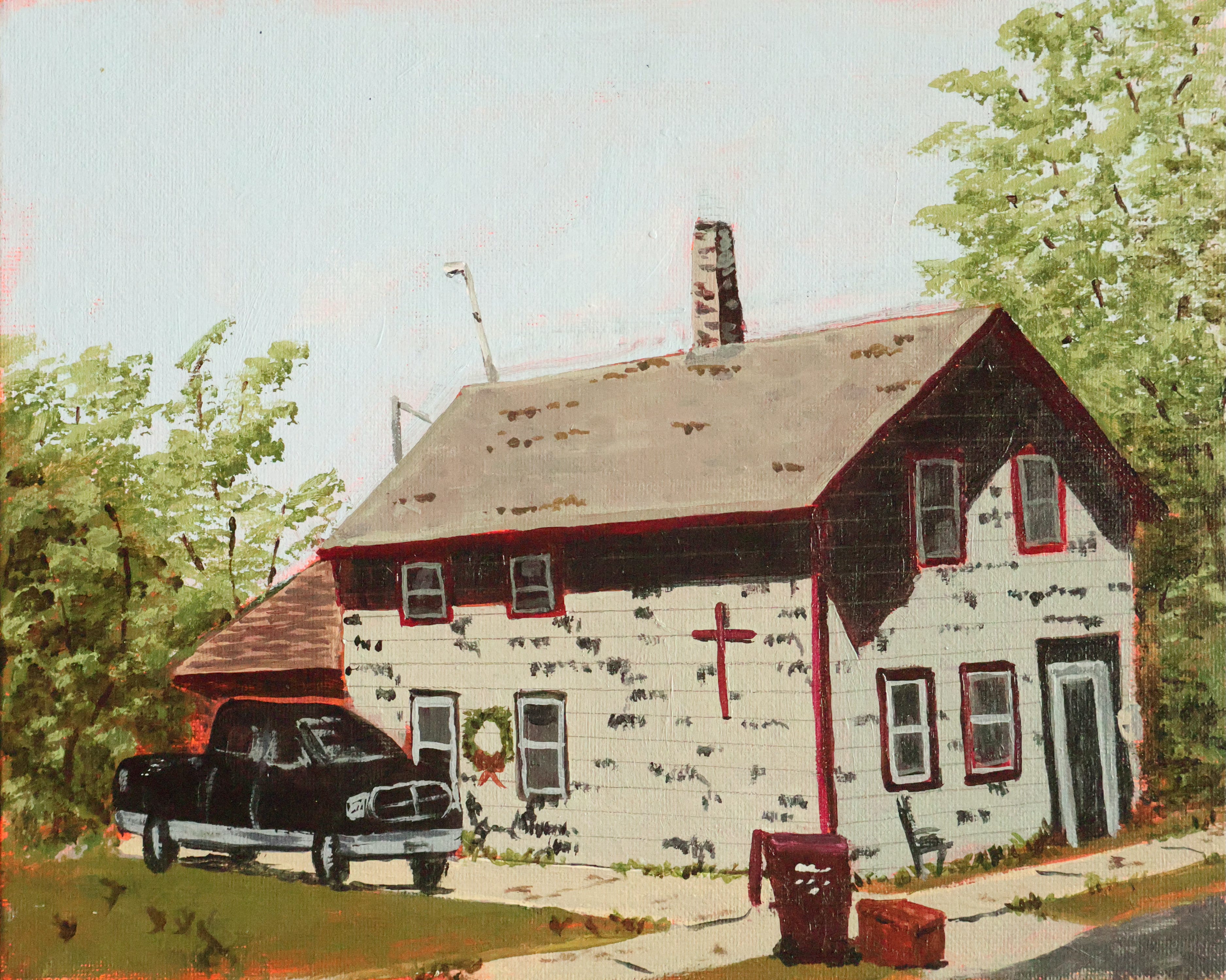 But this cross was more akin to what the cross guy of Green Bay can bee seen dragging around at every farmers’ market and Packers home game. It looked like it was built of scrap lumber and slapped onto the side of the house. If this house was a face, the cross would be the prison tattoo near its eye. Last year I added the photo to my stash of reference images for painting. It is Cross House, my first painting of 2026.