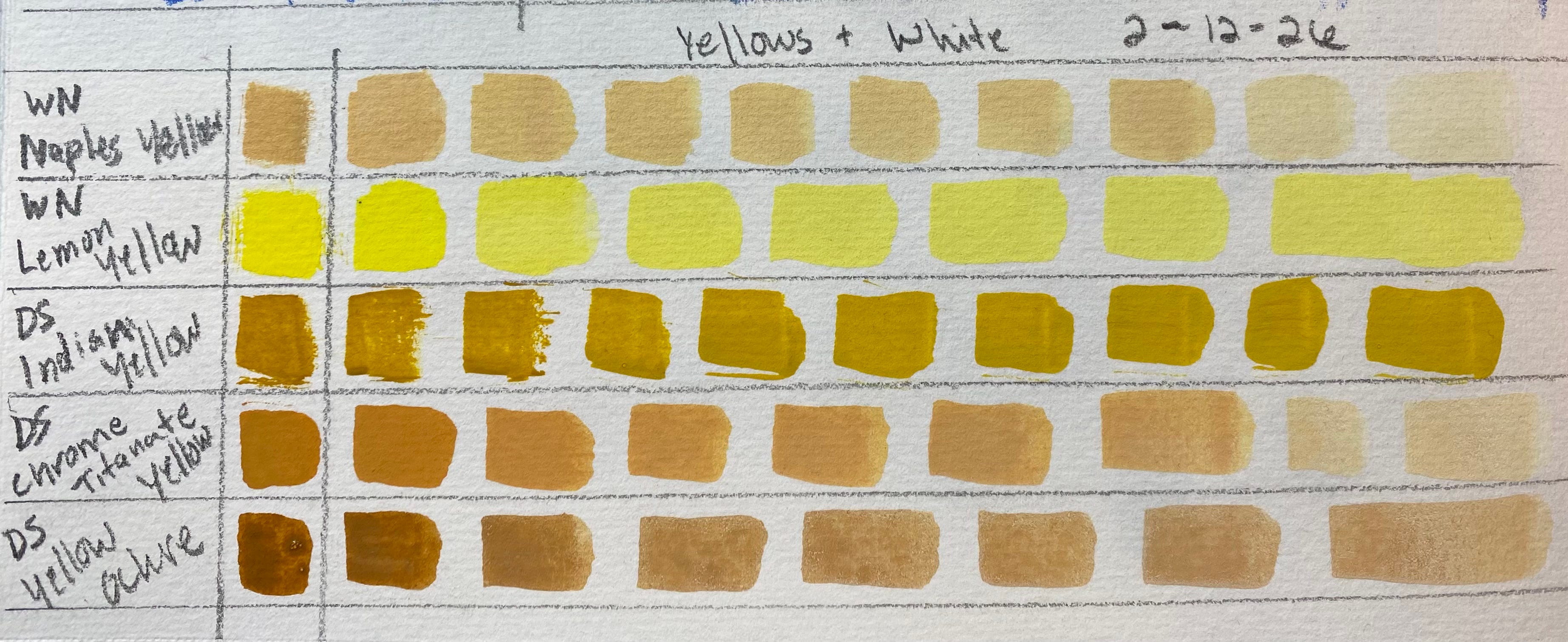 I took a deep-dive into yellow hues of gouache and spent some time making color charts to see how they behave. Acquiring all of these happened accidentally over many months. I don’t even know how LOL! When I buy acrylics, it’s always blues and greens that I go overboard with.
