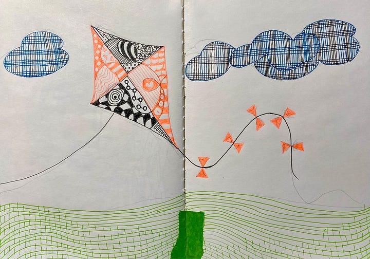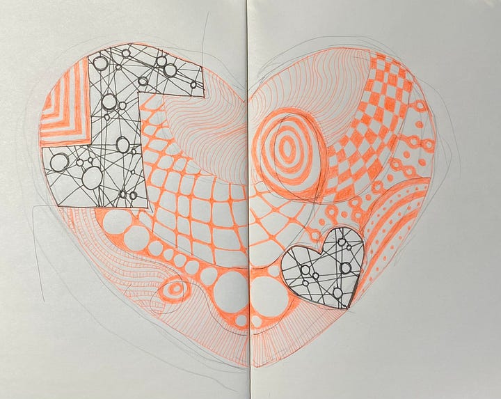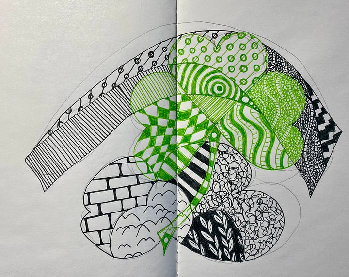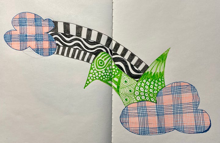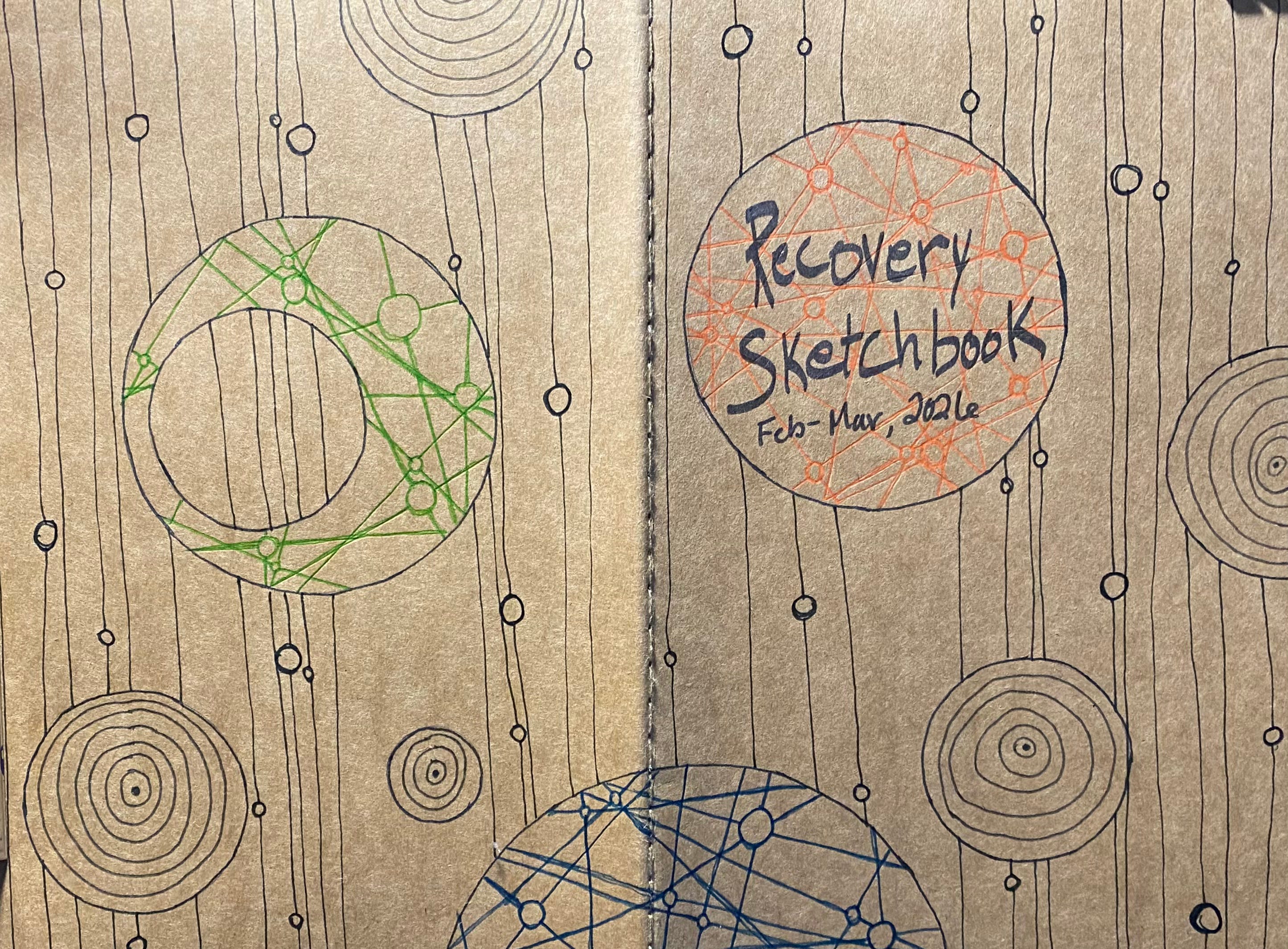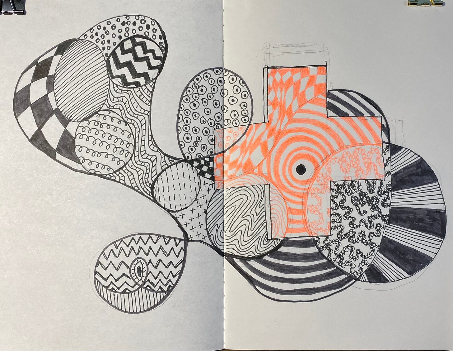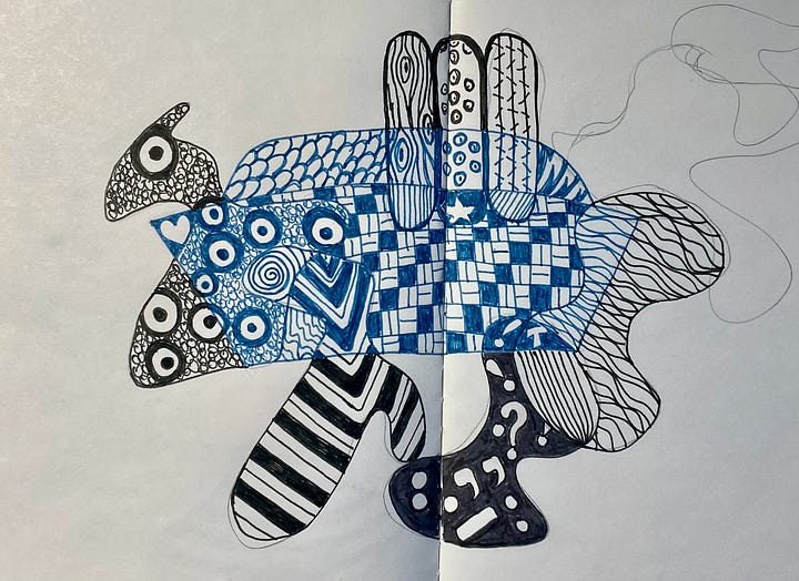 At our New Year’s Eve Weekly Sketch, Lindsay at The Art Garage gifted all of the attendees a small sketchbook. I filled the pages of mine while sitting with my leg elevated day after day during my recovery. It fit nicely on a simple clip board, though I was limited on space and only kept five different markers near me to doodle my way through the healing. Here are some of those doodles: